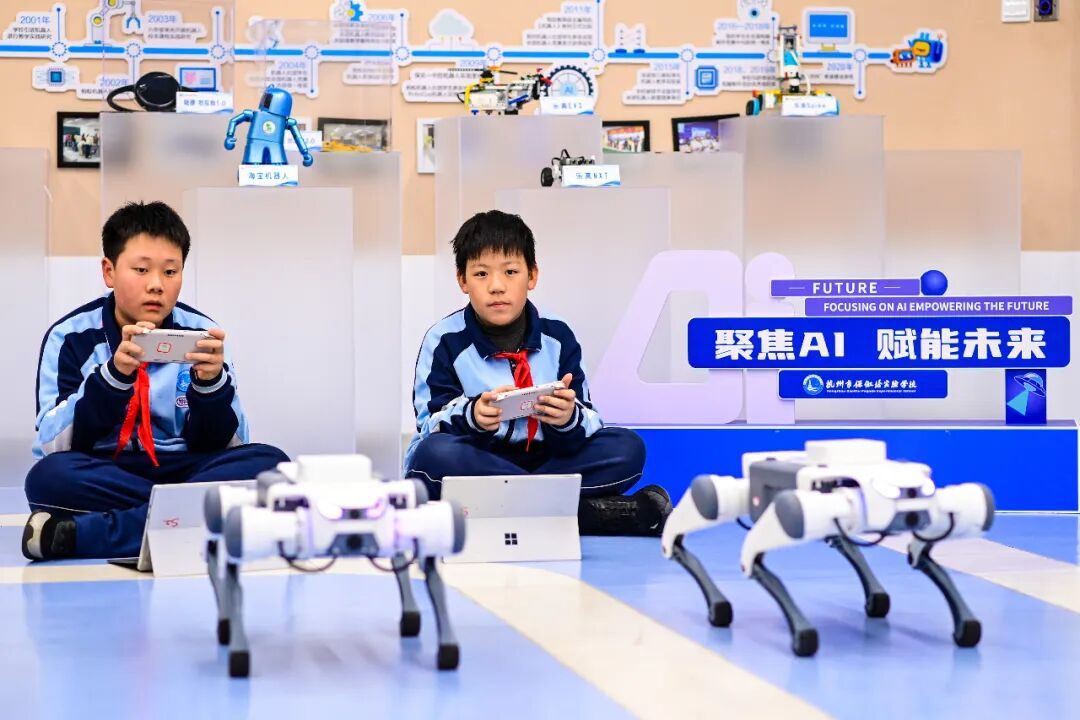 12月2日,杭州市保俶塔实验学校的学生们在东说念主工智能通识课上学习若何给机器狗编程。新华社发