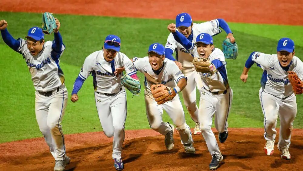 2025年11月19日,广东队球员在广东中山举行的第十五届世界通达会棒球1-4名交叉赛后庆祝收效。图/新华社