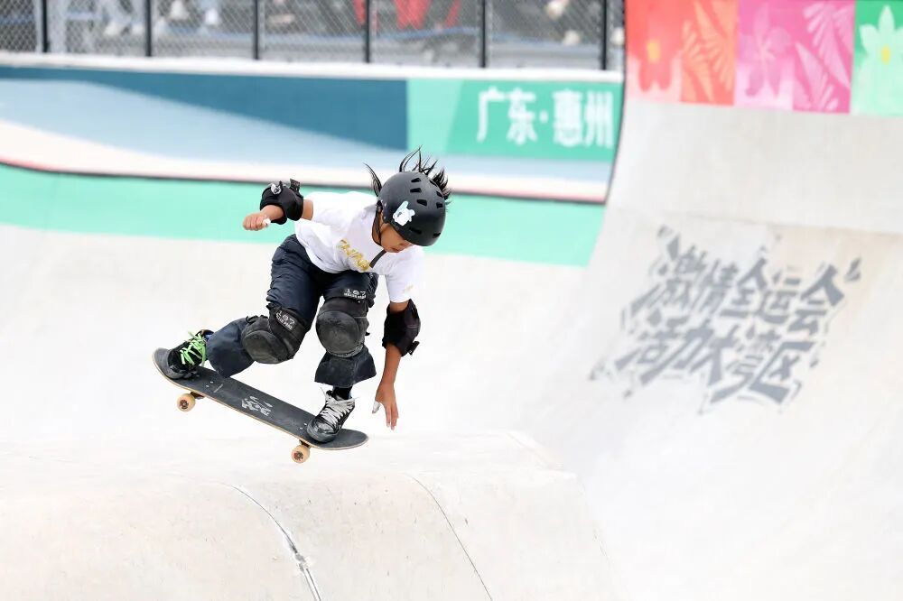 2025年11月11日,广东队选手邹明珂在广东惠州举行的第十五届世界通达会滑板名堂女子碗池赛决赛中。图/新华社