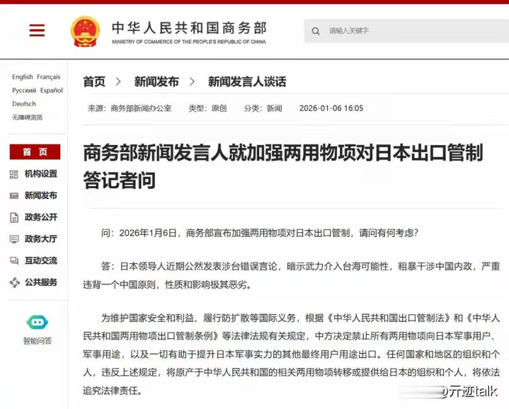1月6日,中国商务部公布一号禁令,不错说2026岁首度禁令等于给高市早苗造作言论的告诫。休止两用物项出口至日本用于军事范围,以及可能触及到军事范围的,休止他国或他东谈主“转手”卖给日本。