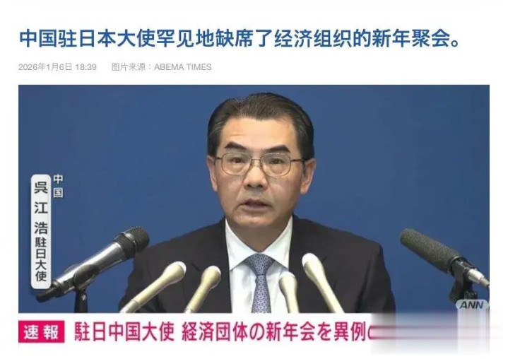 此外,1月6日晚,日本东亚共同体盘问所长处、原日本外务省海外谍报局局长孙崎享发文称:“据悉,日中经济协会和日本海外交易促进协会将于1月7日举行新年致敬疏浚会。中国大使馆已见知主持方,吴江高大使将不会出席。”他还强调,“一位知情东谈主士败露,这项步履从1975年日中建交以来,我印象中方大使从未缺席过。”