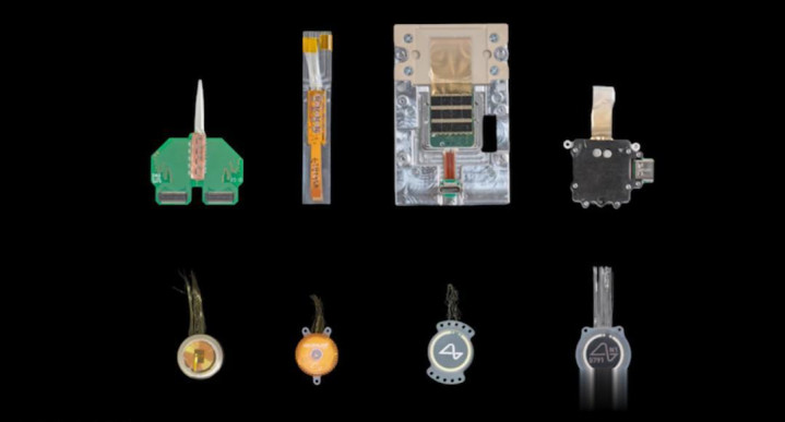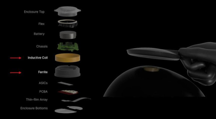 Neuralink植入体的分层结构:包括电板、ASIC芯片、柔性电极阵列,以及用于体外无线充电的感应线圈与铁氧体结构。通盘安设最终镶嵌头骨内,与皮肤皆平,无需外露。