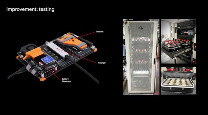 Neuralink的植入体测试体系:左为implant+充电与电板模拟器的硬件测试板,右为多层机架式老化测试安设与高温「脑液」加快老化池。