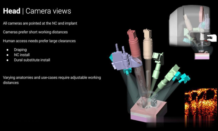 Neuralink手术机器东说念主头部的多录像头视觉系统暗意图:多组显微镜从不同角度同期监控开颅窗口,并结合OCT(右下)及时跟踪脑组织的深度与领悟。