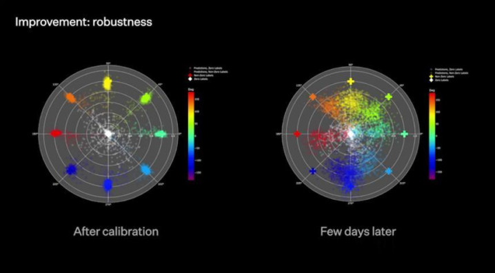 Neuralink的神经解码信号随时期发生漂移。左图为校准完成后的点云散布,右图为数天后的散布。