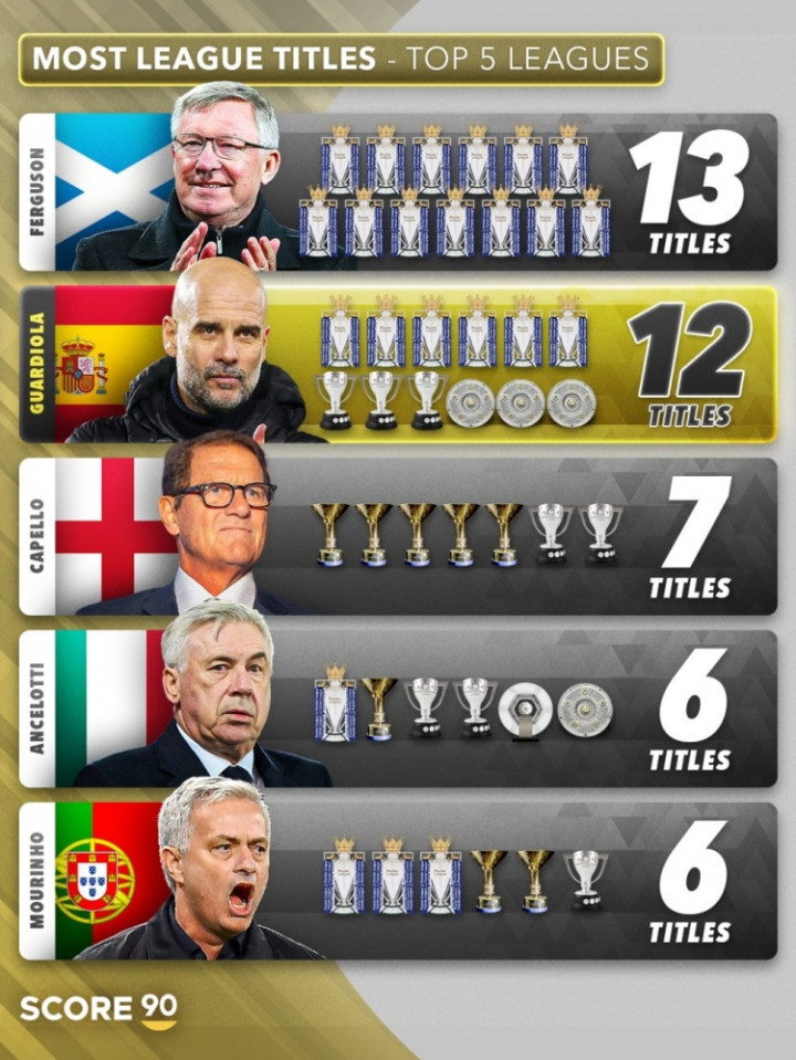 直播吧12月14日讯瓜迪奥拉自登陆英超以来,也曾指示曼城斩获了6个英超冠军,首创了属于蓝月亮的时间。据score90数据统计,自1990年以来,瓜迪奥拉距离追平弗格森爵士顶级联赛冠军数目(欧洲五大联赛)最多的记录,只差1个联赛冠军。score90反问:咫尺,是否也曾到了称瓜迪奥拉为历史最好主栽种(GOAT)的技巧了?