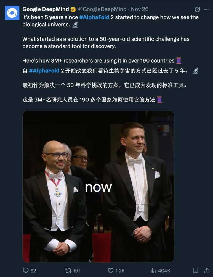 最先来看生命科学界限。上个月,AlphaFold 迎来五周年顾忌。在处置卵白质结构瞻望贫困五年后,该系统已为特出 2 亿个卵白质瞻望了结构,并助力专家 300 多万名询查东说念主员加快科研。这一竖立通过开放数据库透澈改换了结构生物学,并因其对生命科学的深切孝顺荣获了 2024 年诺贝尔化学奖。